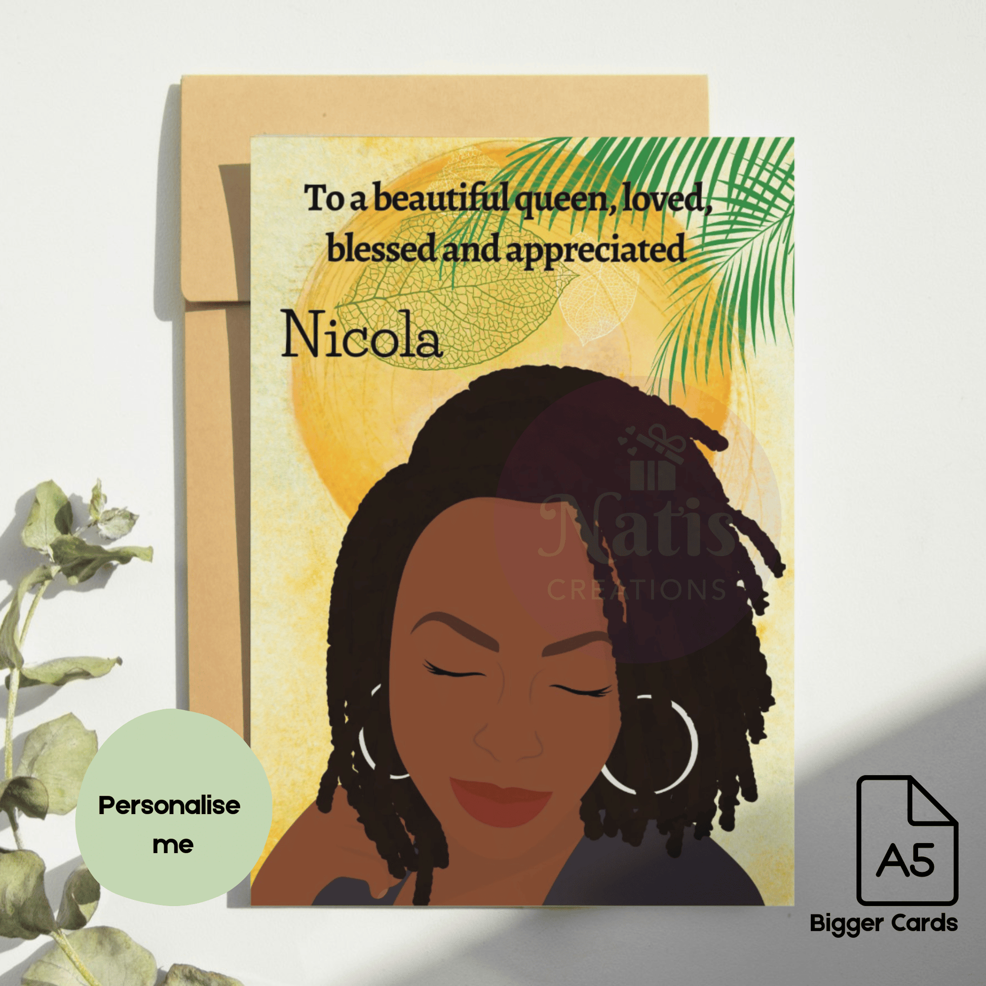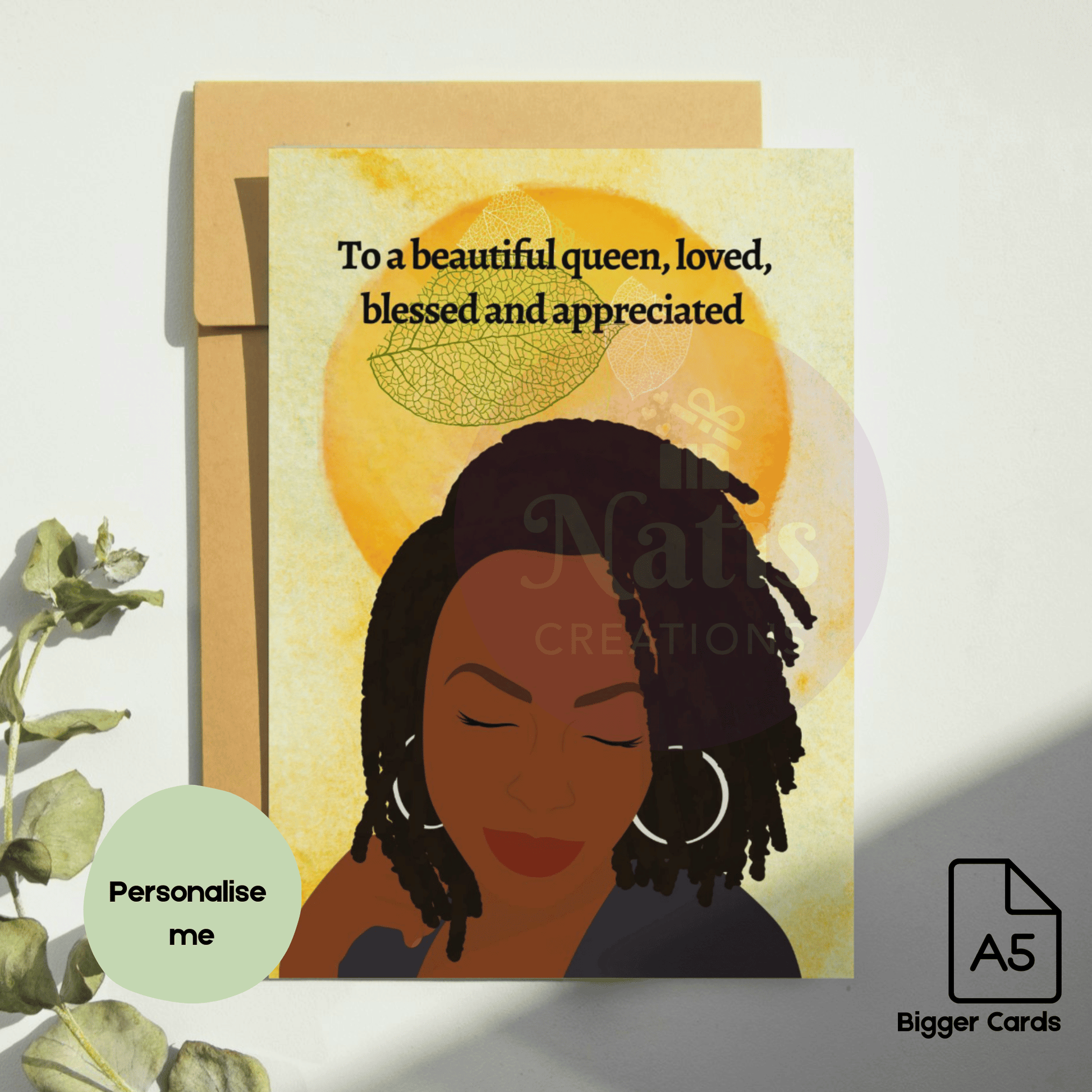 Celebrate the beauty, strength, and grace of Black and Brown women with our exclusive collection of Afrocentric greeting cards. Designed to resonate deeply, each card combines vibrant colors and elegant illustrations that honor heritage, culture, and sisterhood. Perfect for birthdays, encouragement, or any special occasion!