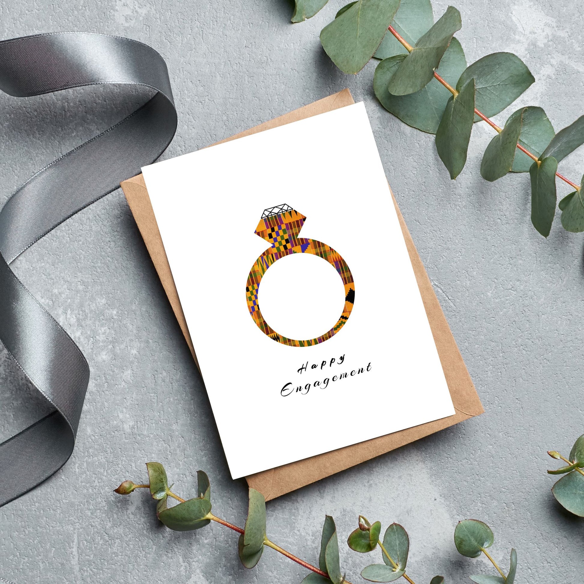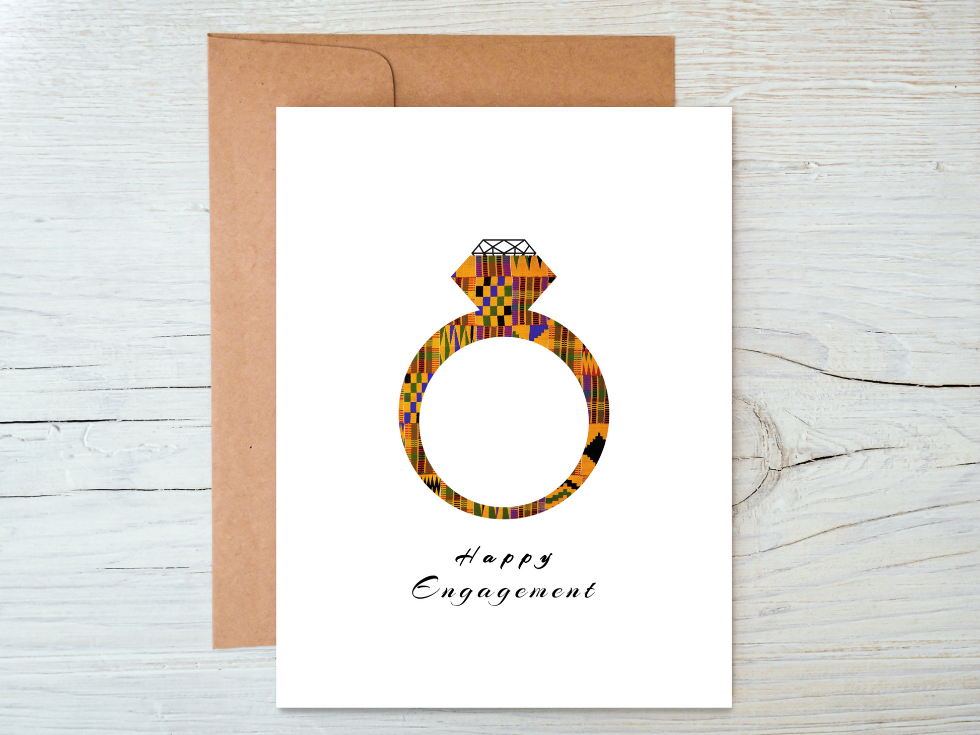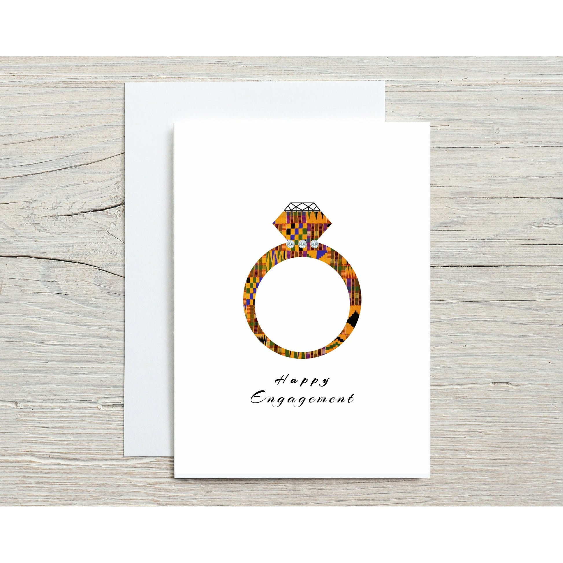 African Kente Print Engagement Ring card for that special couple celebrating a happy life event. This card is perfect and will sure make them smile. Decorated with Crystals