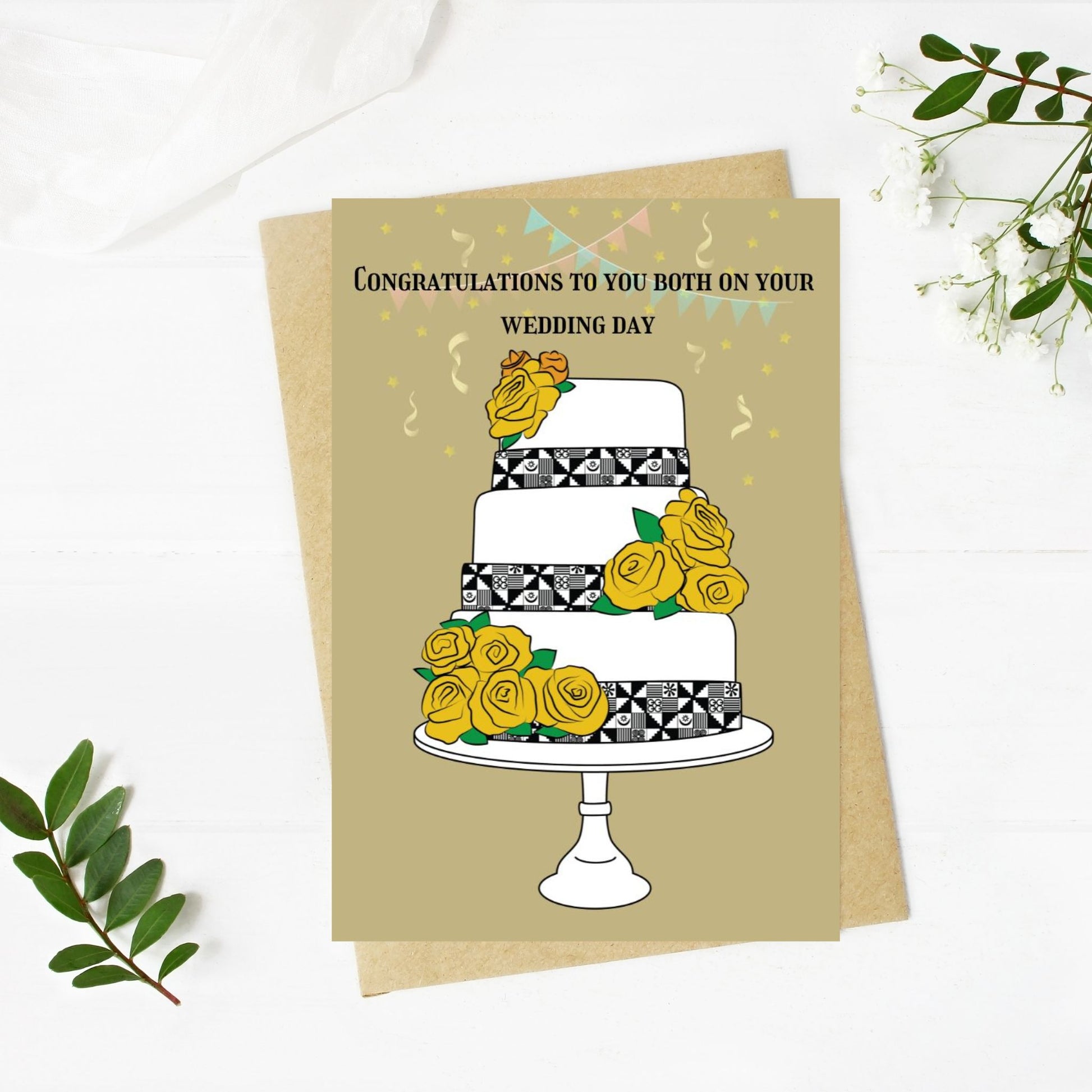 This card features a wedding cake with African Print Kente design ribbons around the cake and decorated with yellow flowers.